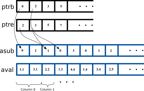 asub: Array of size equal to the number of nonzeros. List of row indexes.aval: Array of size equal to the number of nonzeros. List of non-zero entries of \(A\) ordered by columns.ptrb: Array of sizenumcol, whereptrb[j]is the position of the first value/index inaval/asubfor the \(j\)-th column.ptre: Array of sizenumcol, whereptre[j]is the position of the last value/index plus one inaval/asubfor the \(j\)-th column.