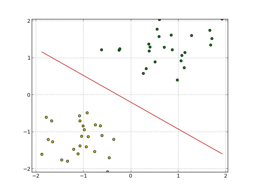 Let \(x_1,\ldots,x_m\in \R^n\) be the given training set and let \(y_i\in \{-1,+1\}\) be the labels indicating the group membership of the \(i\)-th training example. Then we want to determine an affine hyperplane \(w^T x = b\) that separates the group in the strong sense that