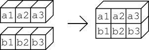 Stacking refers to the concatenation of expressions to form a new larger one. For example, the next figure depicts the vertical stacking of two vectors of shape \(1\times 3\) resulting in a matrix of shape \(2\times 3\).
