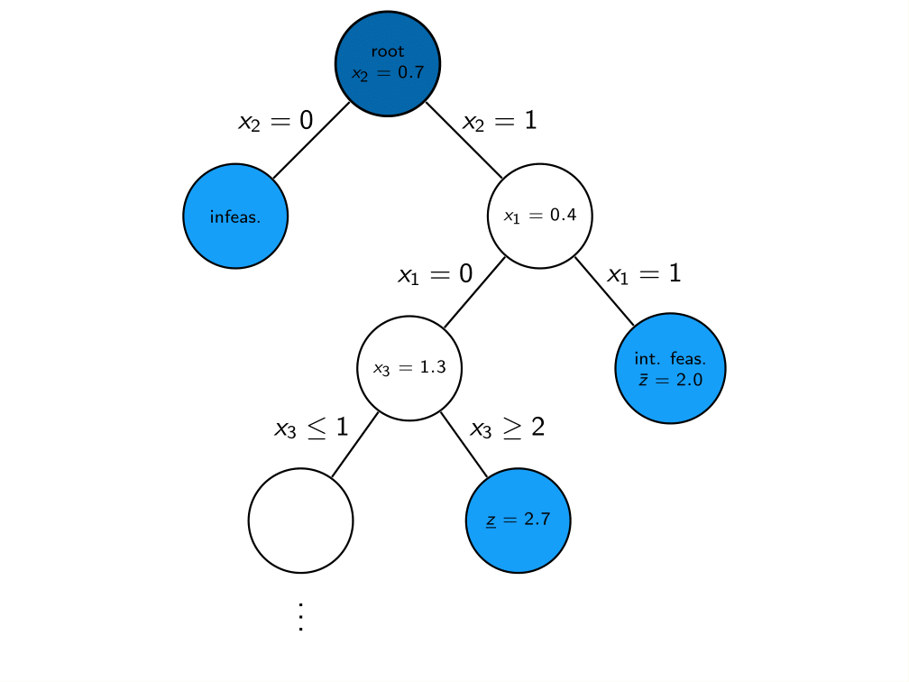 The Branch-and-Bound process continues in this way and successively solves relaxations and creates branches to refined relaxations. Whenever the solution \(\hat{x}\) to some relaxation does not violate any integrality constraints, it is feasible to (13.12) and is called an integer feasible solution. There is no guarantee though that it is also optimal, its solution value \(\bar{z} := c^T \hat{x}\) is only an upper bound on the optimal objective value,
